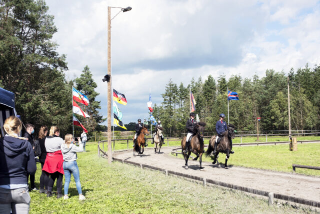 Ríðum, ríðum, rekum yfir sandinn, rennur sól á bak við Arnarfell …“ Durch die Lautsprecher am Rande der Ovalbahn des Islandpferdehofs Streekermoor auf dem Gut Sandheide in Hatten bei Oldenburg tönt das traditionelle isländische Reiterlied „Á Sprengisandi“. „Wir reiten, reiten, jagen über den Sand. Die Sonne sinkt hinter dem Arnarfell …“ Mit den Flaggen ihrer Bundesländer in der Hand reiten sechs Jugendliche eine Ehrenrunde. Sie haben gerade ihre Prüfung in der Sondergangart Tölt hinter sich.
