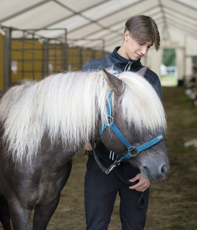 Auf dem Außengelände des 21 Hektar umfassenden Guts Sandheide stehen die Wohnwagen und Boxen der Teilnehmenden und ihrer Pferde. Dort sind auch Noah Dedeceks Isländer Boggi und Baldur untergebracht. Mit seiner Mutter Susi sattelt und trenst er Baldur für das abendliche Training auf. Bevor es auf den Abreitplatz geht, sprüht der 17-Jährige seinem Pferd Mähnenspray ins Haar. „Damit es beim Kämmen nicht so ziept.“ Für ihn ist das Islandpferdereiten mehr als nur ein Sport. „Das Besondere ist für mich das Verhältnis zwischen Mensch und Tier. Beim Fußball oder Skifahren geht es nur um mich selbst oder um meine Mannschaft. Beim Reiten habe ich ein Lebewesen an meiner Seite.“ Noah ist mit Pferden aufgewachsen, die Beziehung zu ihnen empfindet er als enge Freundschaft.
