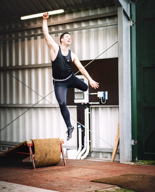 Absprung: Europameister Hendrik Rüdebusch wirft im Training mehr als 70 Meter weit.