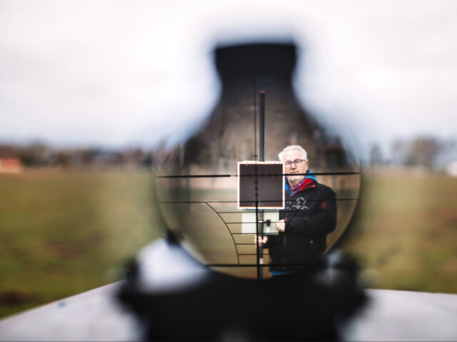 Einige Meter weiter beugt sich Hodel nach vorn und blickt konzentriert durch das Zielfernrohr seines Messsystems. Das Fadenkreuz schweift über den Rasen des Sportplatzes, dann erfasst es das Schild, das mit einer Wasserwaage an einem Teleskopstab aus dem Gartencenter befestigt ist. Hodel drückt auf einen Knopf, der Laserstrahl misst die Entfernung bis zum Schild. Über seinem Kopf blinkt die Anzeige auf: 73,4 Meter. Zufrieden richtet sich Hodel auf. Seine Konstruktion funktioniert – egal bei welchem Wetter.