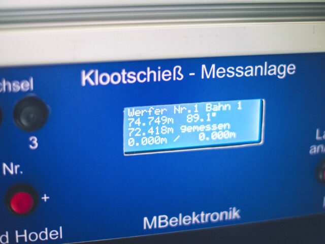 Ebenfalls zur Anlage gehört der dunkelgrüne Container wenige Meter neben der Anlaufhalle. Wichtig ist vor allem das, was sich darin befindet: Maschinenbauingenieur Hodel hat sich ein besonderes Messsystem für die Anlage einfallen lassen; eine Laserkonstruktion, die exakt misst, wie weit eine Klootkugel fliegt. Dafür ließ er ein Zielfernrohr auf einem Laser befestigen: Mithilfe des Zielfernrohrs kann der Laser auf ein Schild ausgerichtet werden, das eine Assistentin oder ein Assistent genau dort in den Boden steckt, wo die Kugel nach dem Wurf einschlägt. Ein Display außen am Container zeigt dann an, wie weit die Kugel geflogen ist.
