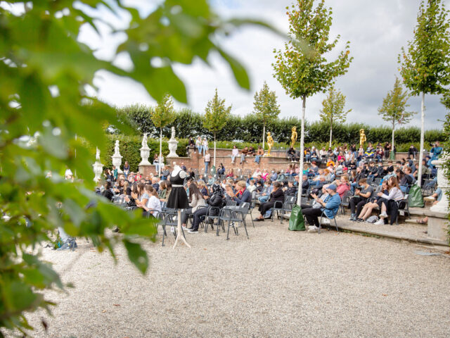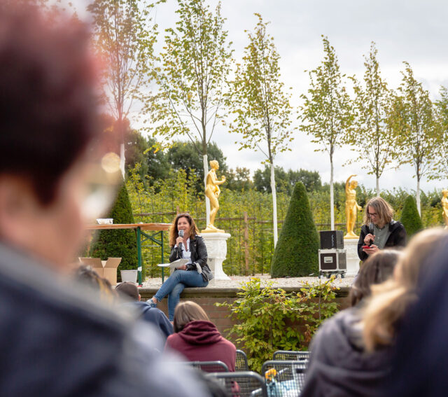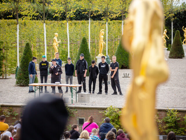 Christina Fricke, die im Auftrag der Landeshauptstadt Veranstaltungen für Kinder und Jugendlichen in den ehrwürdigen Gärten organisiert, hat zwei Schulen ausgewählt, die ihre jährliche Projektwoche zur Berufsorientierung ins grüne Herrenhausen verlegen. Heute sind 240 Schüler:innen der Leonore-Goldschmidt-Schule da. Sie kichern und wuseln aufgeregt herum. Hellwache Neuntklässler:innen, die hier Zeit, Raum und Ansprechpartner:innen für ihr Tempo und ihre Ideen finden. Für eine Woche gehört der Große Garten ihnen. Die Gäste, das sind Freunde und Familien, die die Teenager zur Abschlusspräsentation ihrer Projektwoche ins Gartentheater eingeladen haben.