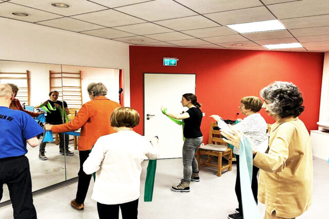 In Hannover üben Senior:innen gemeinsam in „Gymnastik, aber richtig“ vor einem großen Spiegel, Bewegungen korrekt auszuführen. Neben dem sozialen Austausch hilft der Spiegel, die eigenen Bewegungen zu sehen und mit der innerlichen Wahrnehmung abzugleichen. Die Übungen verbessern das Körpergefühl und dienen der Sturzprävention. ◼