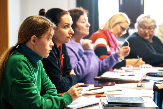 Am Nebentisch in dem großen Raum im Erdgeschoss lernen die Menschen mit wenig Deutschkenntnissen. Einen Raum weiter sitzt eine kleine Gruppe von Analphabetinnen, ein paar Frauen, die die Chance nutzen wollen, in Deutschland nicht nur eine neue Sprache, sondern auch lesen und schreiben zu lernen. Geht man durch diesen Raum, an einem schwarzen Klavier vorbei und einige Stufen im Treppenhaus nach oben, landet man bei den Ukrainer:innen. So sagt man hier der Einfachheit halber zur Gruppe der Geflüchteten, die nach dem russischen Angriffskrieg auf ihr Land in Verden eine sichere Heimat gefunden haben. Eine ausgebildete Deutschlehrerin unterrichtet hier.