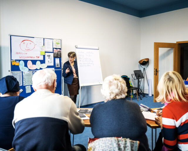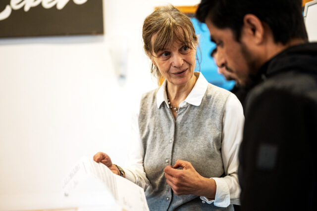 Iris Guth leitet das Sprachcafé und ist dort mit einer halben Stelle angestellt. Die Förderung durch die Lotto-Sport-Stiftung hilft, das Angebot auch nach acht Jahren aufrechtzuerhalten. Mit Guth kümmern sich neun Ehrenamtliche um die Besucher:innen. Guth ist eigentlich BWLerin, hat lange bei der Sparkasse im Auslandsgeschäft gearbeitet und ein Talent für Sprache. Sie beherrscht Französisch, Englisch, Russisch und ein bisschen Schwedisch. Iris Guth spricht klar, das offene Lächeln gehört zu ihr. Ganz selbstverständlich bindet sie alle ins Gespräch ein und animiert zum Mitmachen, ohne dass es wie ein Gang an die Tafel wirkt. „Ich versuche, auf die Worte einzugehen, die die Menschen hier beschäftigen“, sagt Guth. Und das sind dann eben oft auch sperrige deutsche Amtsbegriffe. In der Anfangsphase des Cafés hat sie die Bücher gelesen, die man beim Lernen für Abschlüssen wie A1 oder B1 nutzt – um zu wissen, welche Inhalte eigentlich wichtig sind.