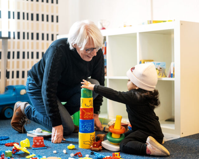 Ein Mittwochmorgen im November. Iris Guth sitzt heute mit vier jungen Frauen und einem jungen Mann an einem sechseckigen Tisch aus Holz, dahinter spielen Kinder mit Holzklötzen und Luftballons. Der Raum ist groß und hat einen himmelblauen Teppich. „Neue Wörter“, sagt Guth. Sie hält einen karierten Schreibblock in die Runde, hat dort in Blau das Wort „reichen“ aufgeschrieben. „Leila, kennst du das?“ Und dann entspinnt sich in der Gruppe ein Gespräch, in dem die Teilnehmenden ganz organisch die deutsche Sprache lernen.