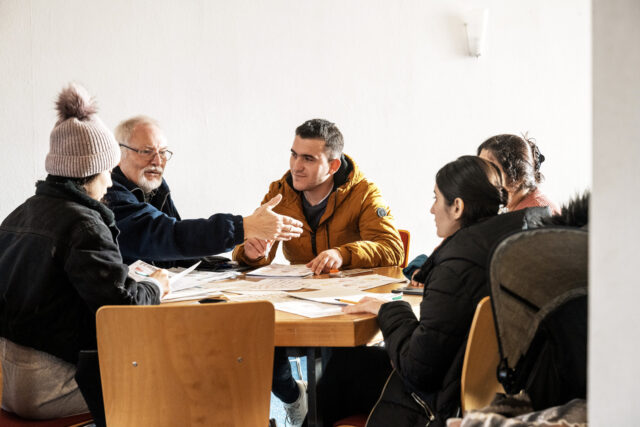 Im Jahr 2015, als viele Geflüchtete nach Deutschland kamen, fanden einige von ihnen in der Sporthalle direkt gegenüber dem Gemeindehaus ein vorübergehendes Zuhause. „Wir müssen was tun“, dachte der damalige Pastor und öffnete den Ort. Kaffee und Begegnung sollte es geben, aber bald merkte man: Was die Menschen brauchen, ist Hilfe beim Ankommen. Das heißt vor allem: Hilfe bei der Sprache.