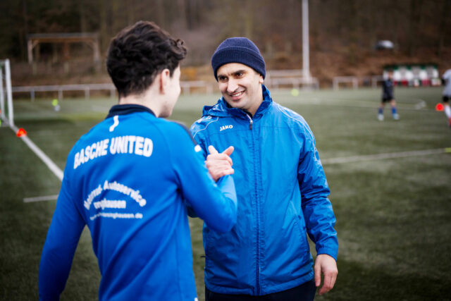Ein gutes Jahr später steht er nun neben Mehmet Emin Miisoglu auf dem Trainingsplatz und erzählt vom Projekt. Drei weitere Traineranwärter hat man mit der Aktion gefunden, alle sind im Verein als Co-Trainer eingebunden, in der Jugend oder bei den Herren. Für Mehmet Emin Miisoglu war klar, dass er mit Jugendlichen arbeiten wollte. Er sah die politisch-soziale Komponente, die er unterstützen wollte. „Ihr findet nicht so leicht einen Trainer für die Jugendlichen so kurz vor oder schon in der Pubertät, davon viele mit einem Migrationshintergrund“, sagte Miisoglu und war da. Der Kurde, in der Türkei geboren und aufgewachsen, kam mit sieben Jahren nach Deutschland. Er weiß, wie das Leben zwischen den zwei Welten ist, welche Vorurteile einige seiner Spieler:innen ertragen müssen, was die Hürden sind, die manche ihrer Teamkolleg:innen so nicht kennen.