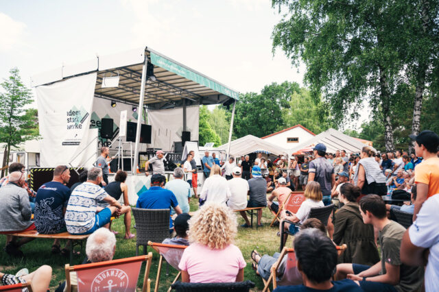 Eine solche Weltmeisterschaft ist nicht möglich ohne die Menschen, die ehrenamtlich alles geben, um den Startenden beste Bedingungen zu sichern. In Mardorf kümmert sich der Yacht-Club Niedersachsen um den Rahmen. Ein kleines Team um den Sportwart Lothar Knopf hat zusammen mit dem Leitungsteam um Deiterding über Monate alles geplant. Knopf ist viel unterwegs an diesen Tagen im Juni. Das Handy hat er immer in der Hand und oft am Ohr. „Das geht alles Hand in Hand – ich bin stolz, wie gut es läuft“, erzählt Knopf, weißes T-Shirt mit der eingehängten Lesebrille, rote Shorts, dazu – natürlich – Segelschuhe. Und die Teilnehmenden melden das auch zurück. Das Buffet sei eben viel mehr als „Bratwurst vom Grill“, sagt Knopf. Stattdessen gibt es zur Eröffnungsfeier ein vom Küchenteam frisch gekochtes Nudelbuffet, nach jedem Renntag einen hausgemachten Snack und abends dann auch echtes Grillgut, Salate und sogar Nachtisch. Leicht war die Organisation nicht. Eine Bühne, Toiletten, Essen, viel Equipment – all das muss ja erst einmal organisiert und auch bezahlt werden. Dabei half die Unterstützung durch die Lotto-Sport-Stiftung für den ausrichtenden Yacht-Club.